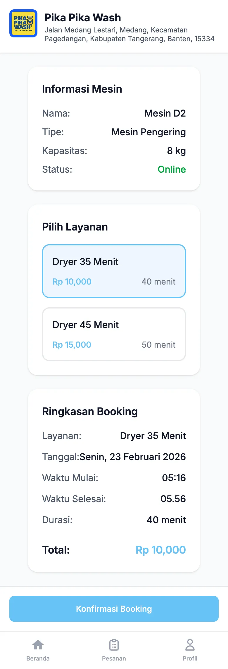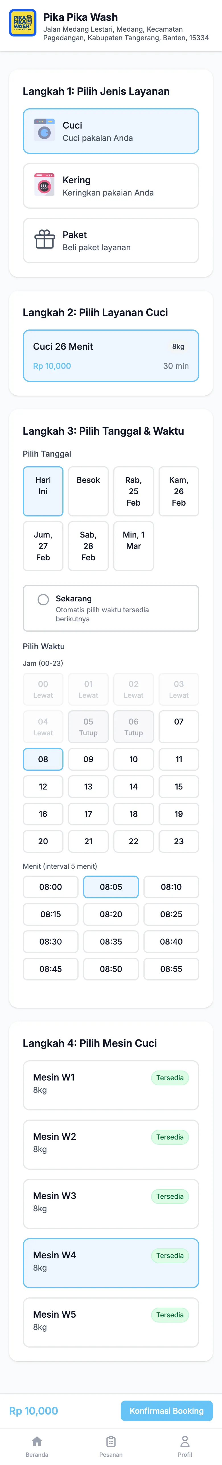 Pelanggan bisa booking mesin dari rumah, pilih tanggal & waktu, dan datang saat jadwal sudah siap. Cocok untuk laundry di apartemen atau area residensial.