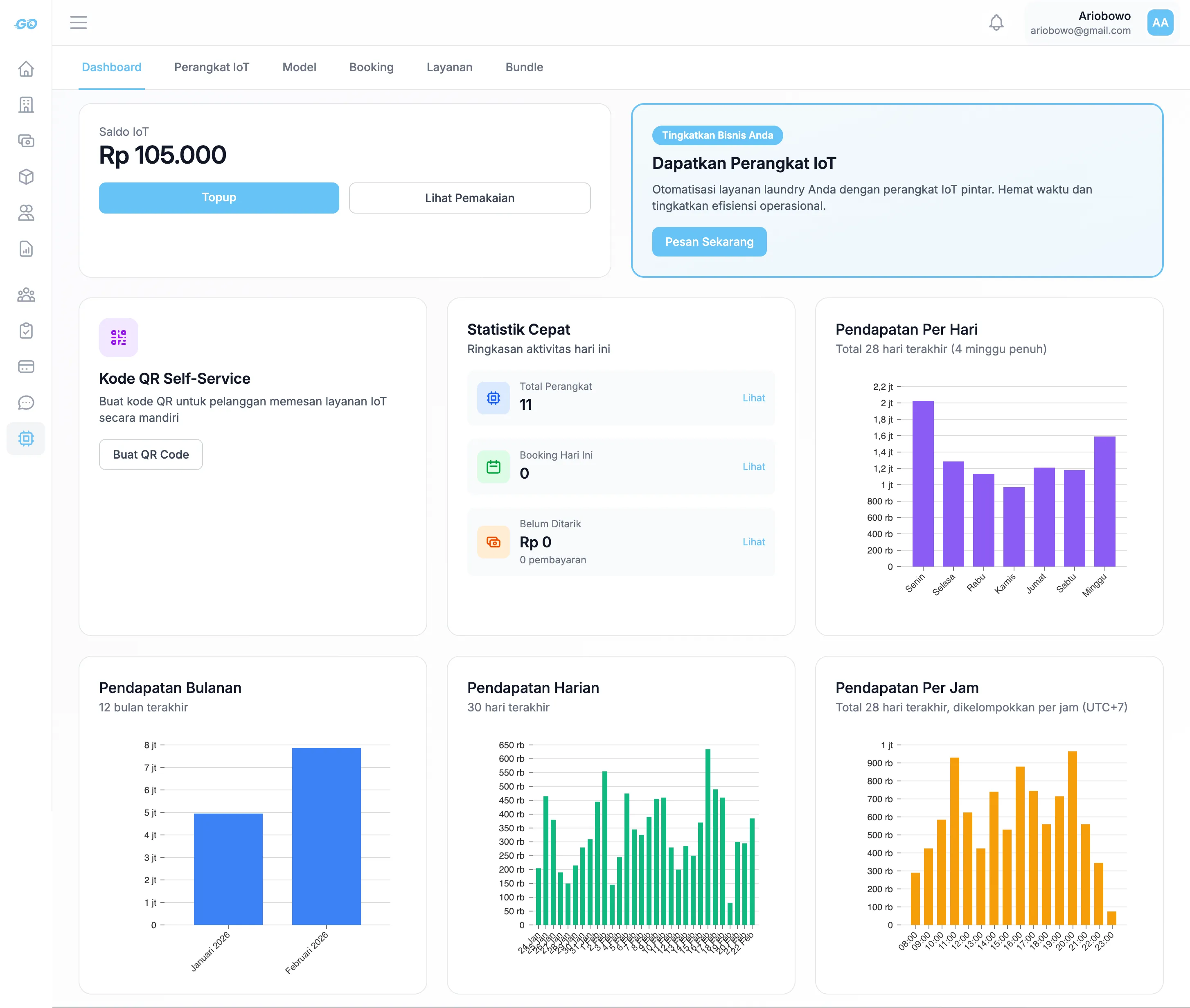 - Statistik real-time: total perangkat, booking hari ini, belum dibayar