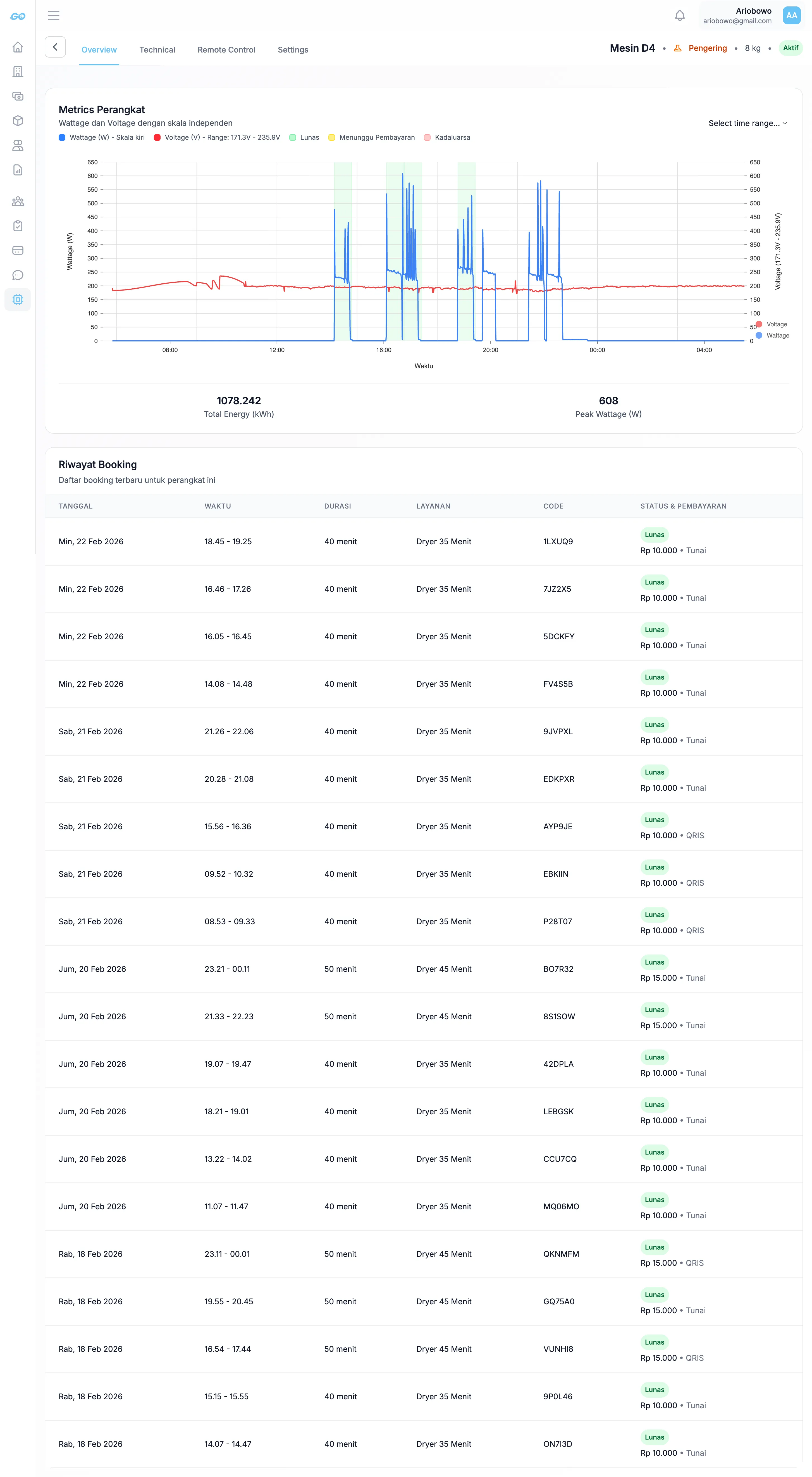 Pantau performa setiap mesin dari satu dashboard. Lihat grafik penggunaan, riwayat booking, dan pendapatan — kapan saja, di mana saja.