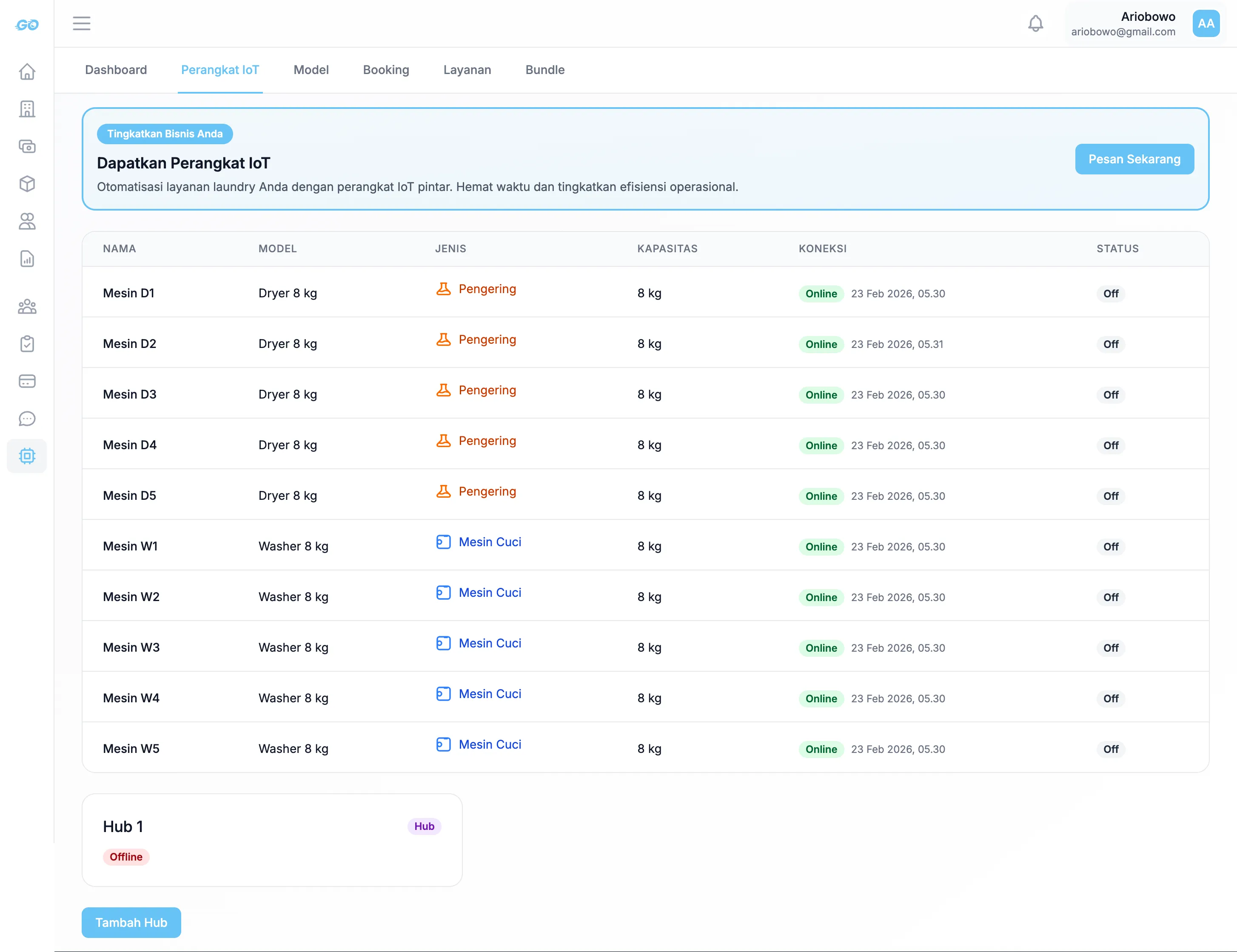 Lihat status seluruh mesin cuci dan dryer Anda dalam satu halaman. Pantau koneksi, kapasitas, dan status operasi secara real-time.